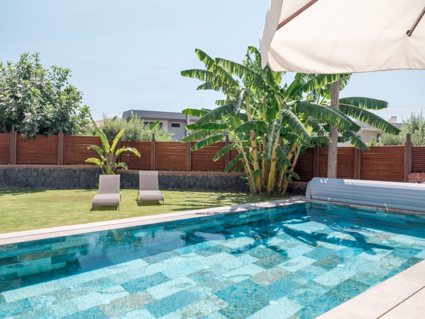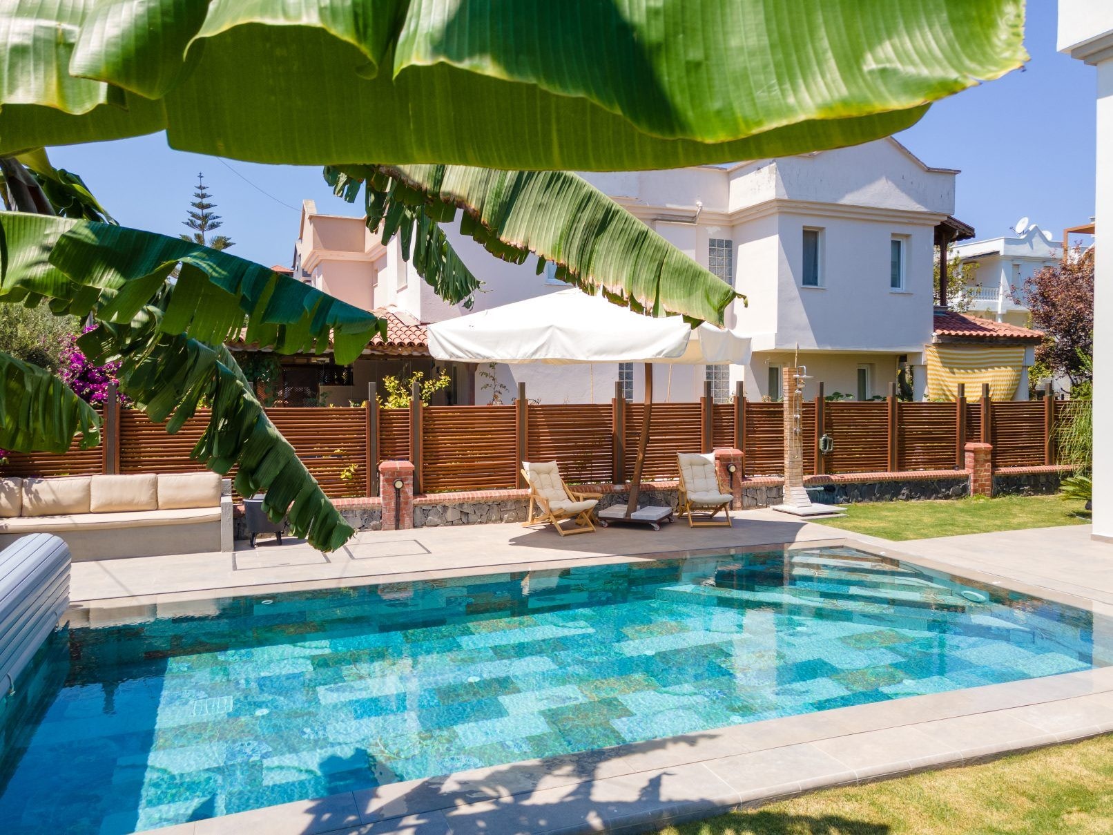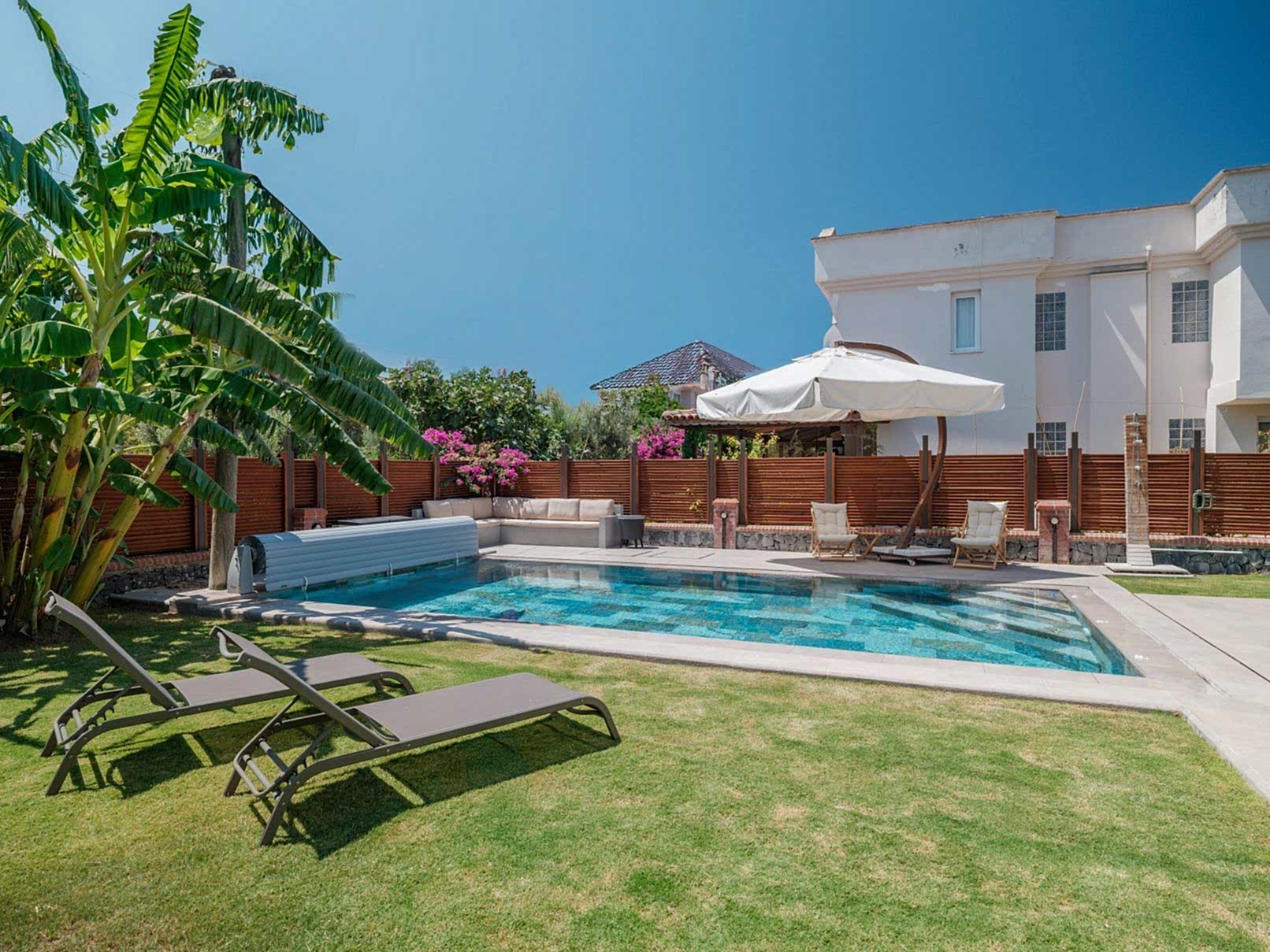 Çeşme Dalyan projemizde müşterimizin isteği üzerine özel olarak tasarladığımız havuz ile bahçelerini en verimli şekilde değerlendirdik.