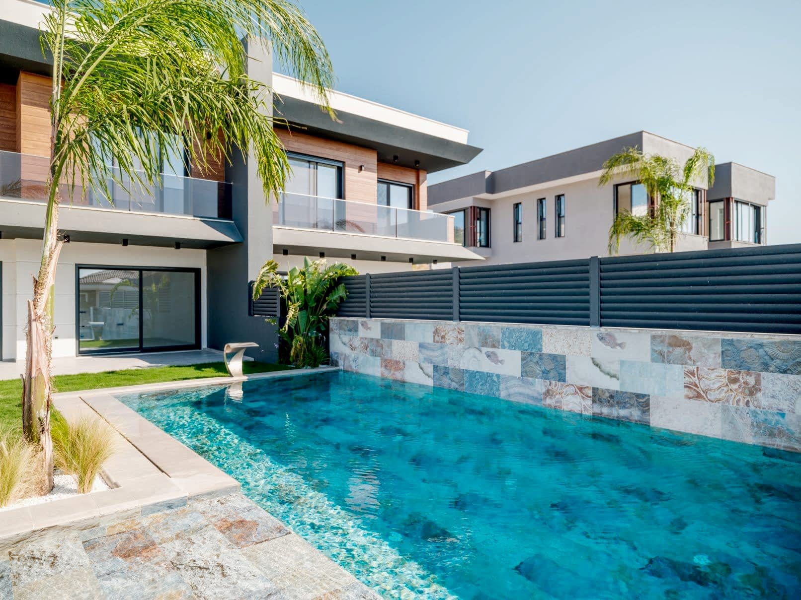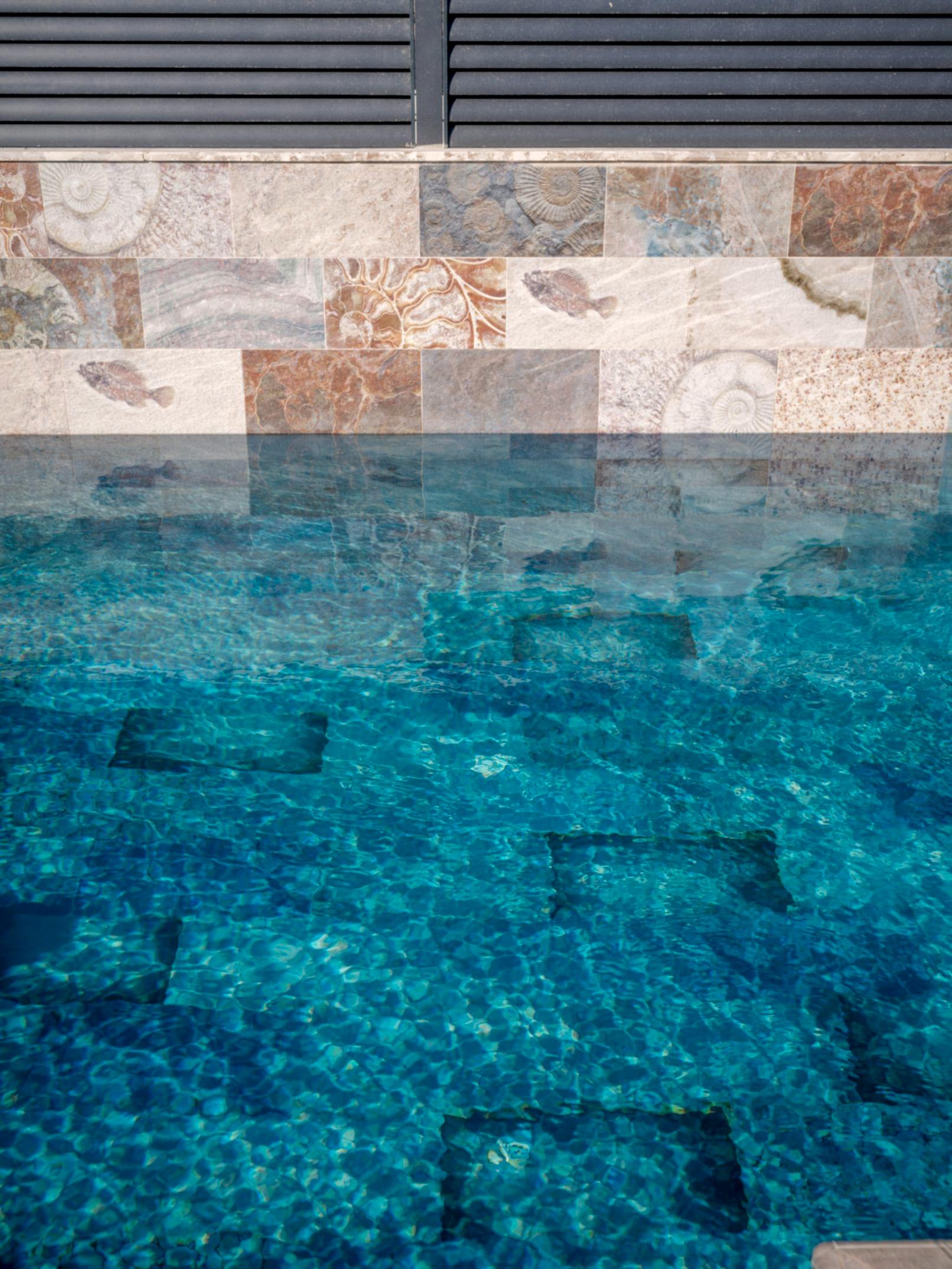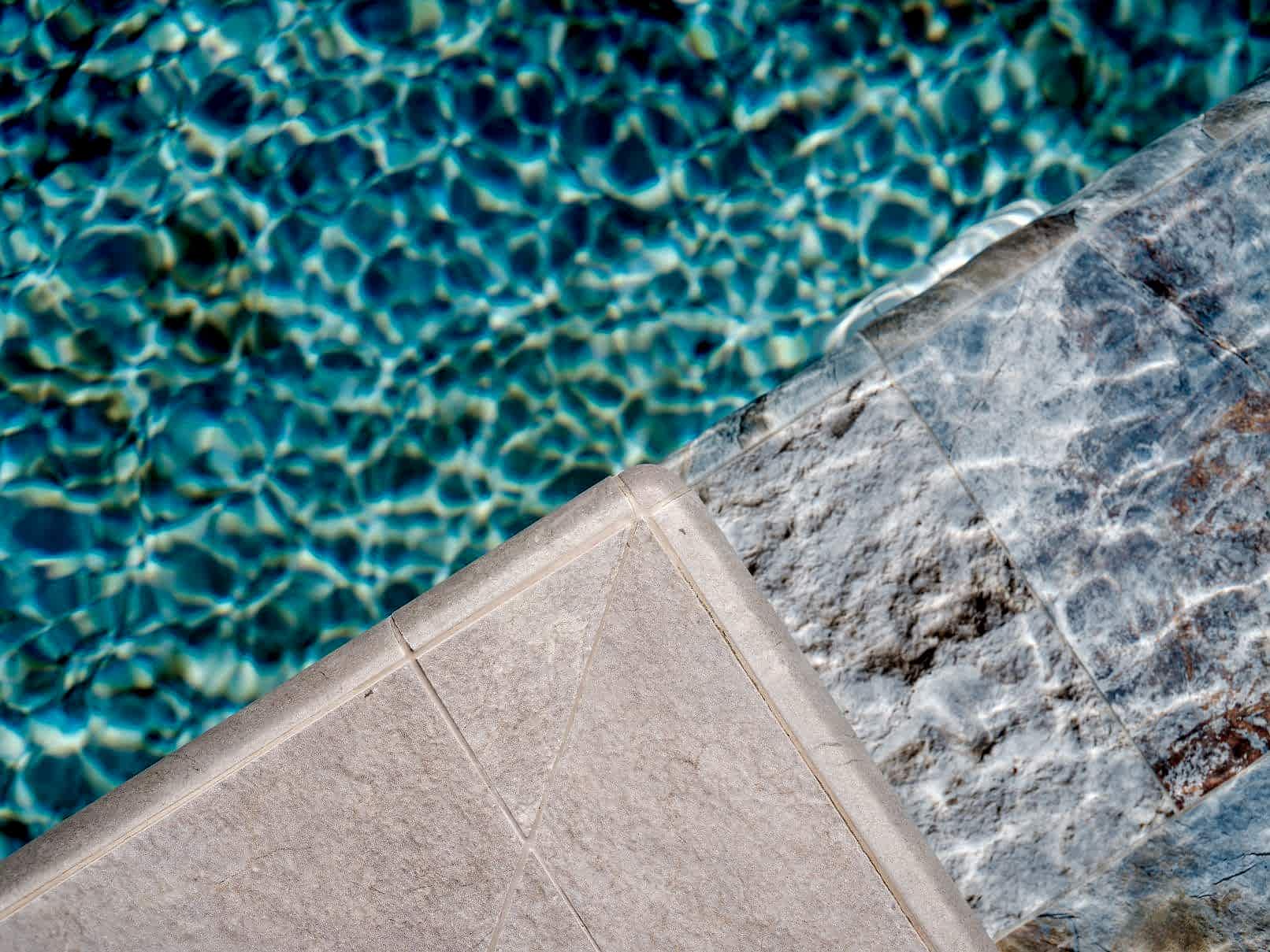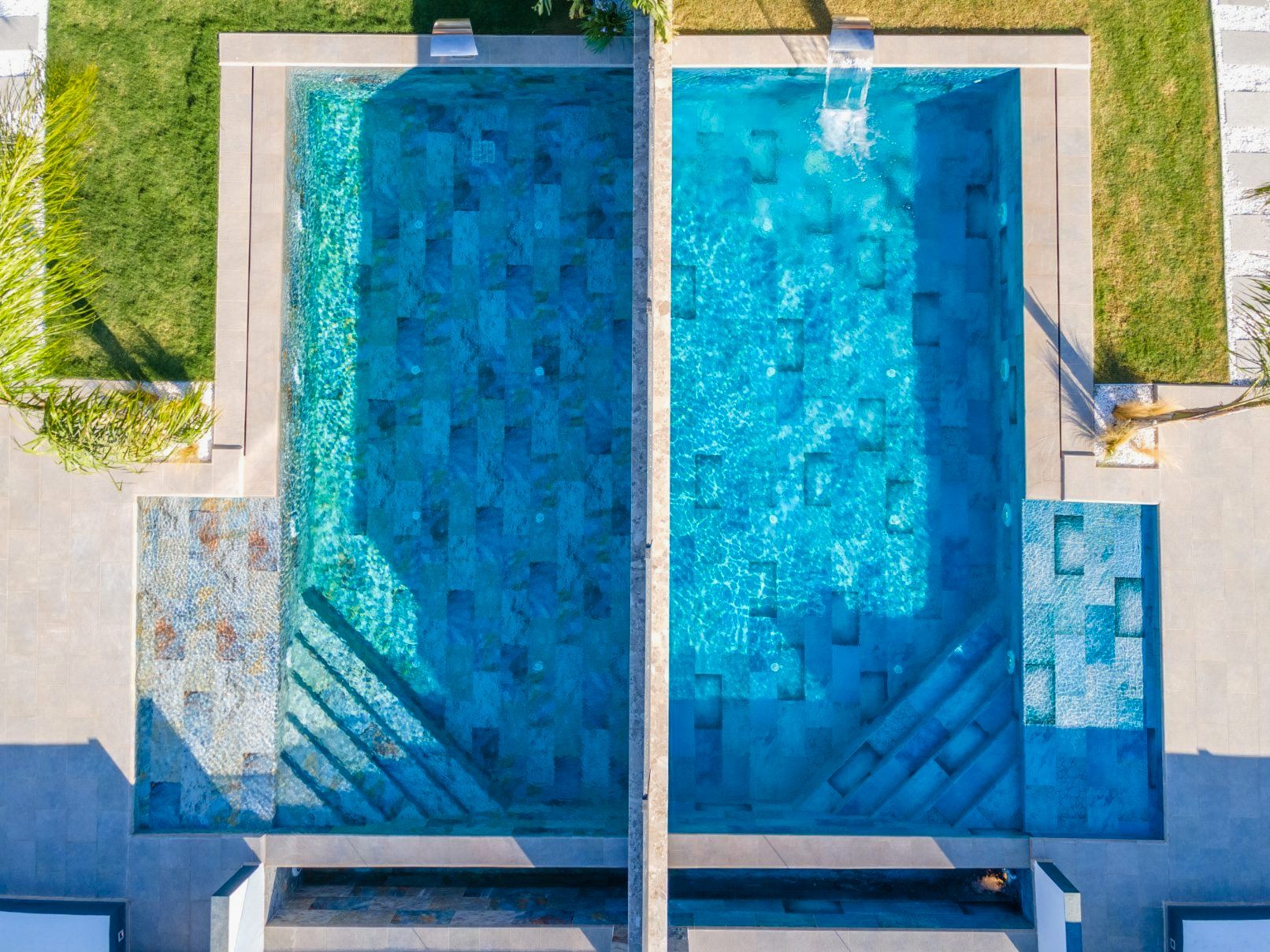 🖼️ İki havuzun ortak duvarında, havuzların bütünlüğünü sağlamak için aynı üründen farklı model kullanarak estetik bir uyum sağlandı.