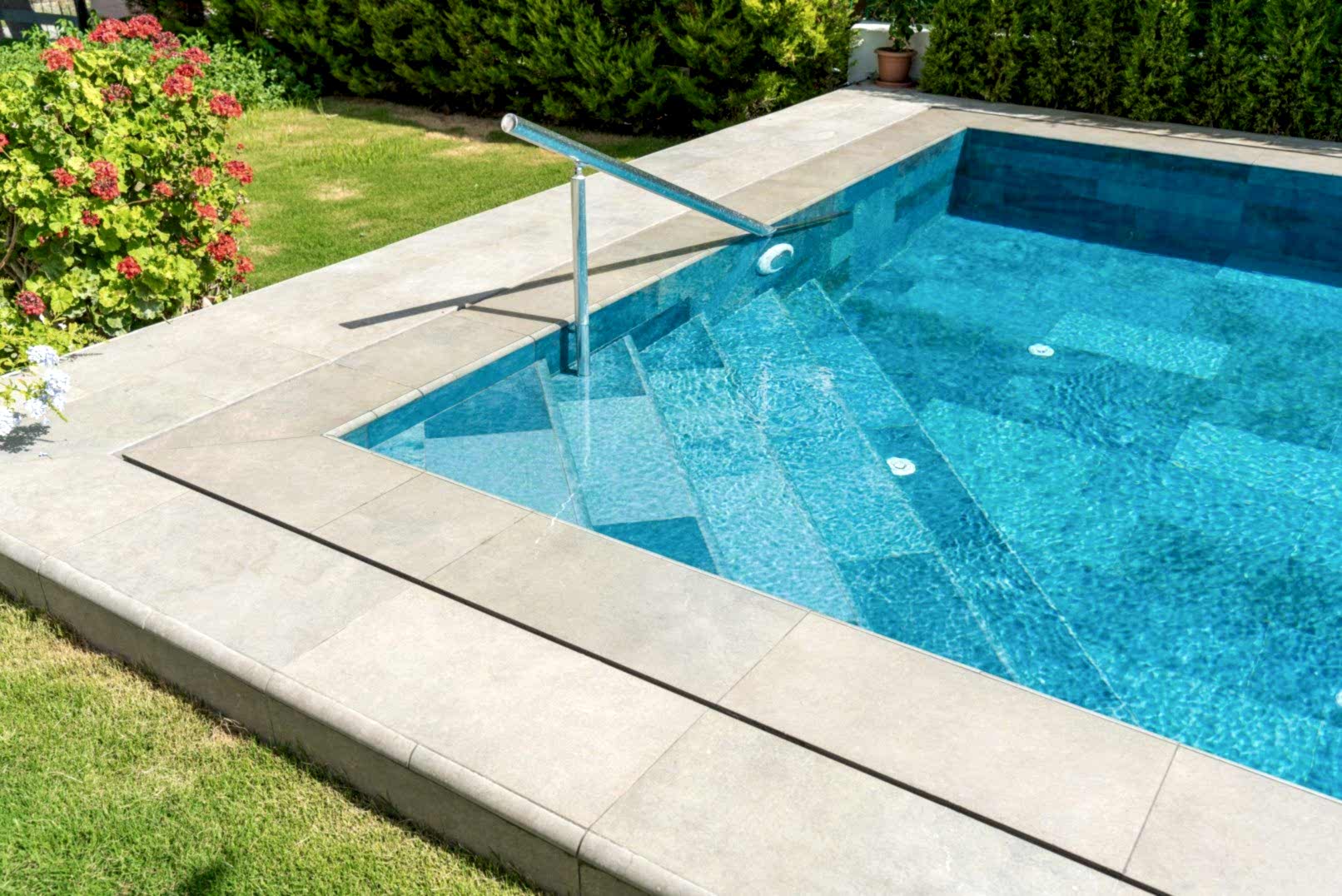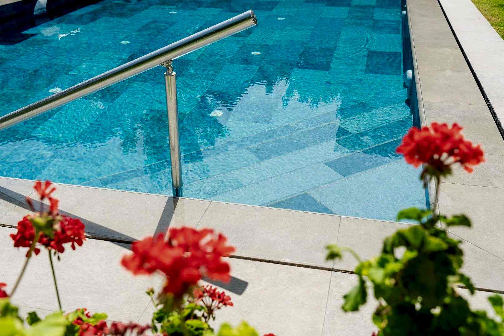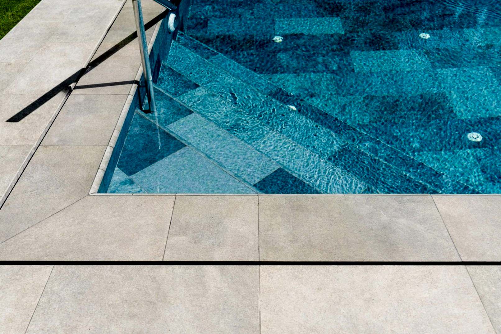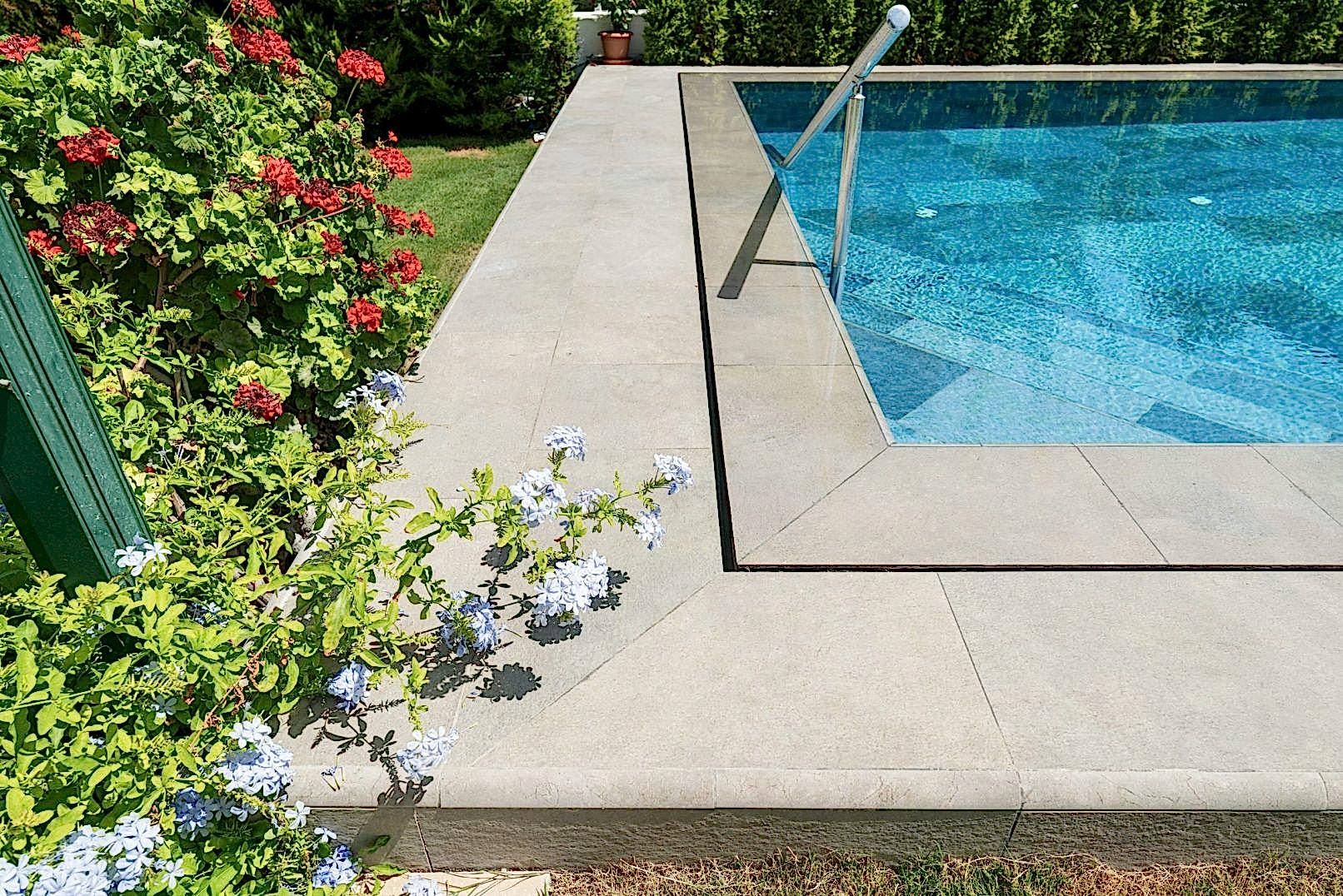* Havuz etrafı küpeşte ve güneşlenme alanında 33×66 Serapool Natural Seri Mocha.